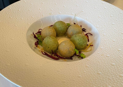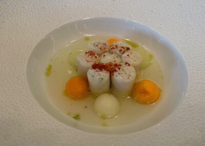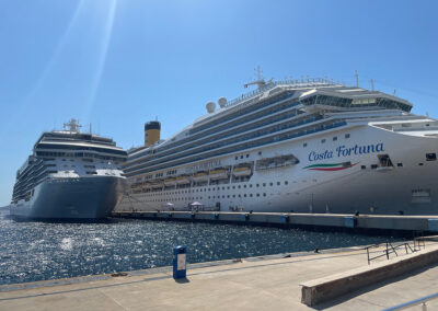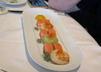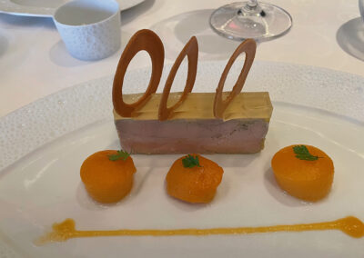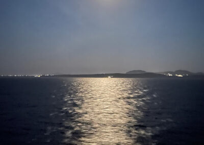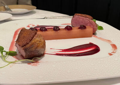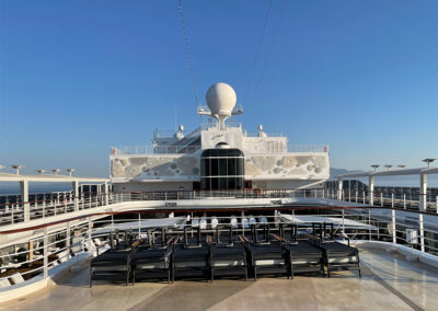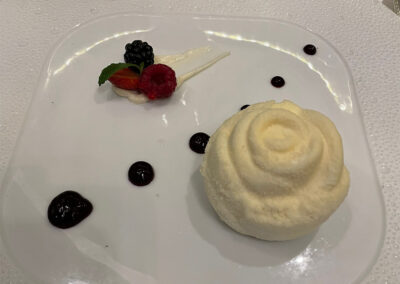 On return to the ship, Judy and I went to our final day of trivia games, collected a couple of items with our week’s winnings, then went to dinner at Chartreuse. Surprise. We shared a table with a couple from England who sat next to me at the tasting. The small world struck again! The dinner was excellent, and the conversation even better. After dinner it was grab a drink in the Meridian lounge, head up to Deck 8, and turn in for the night.