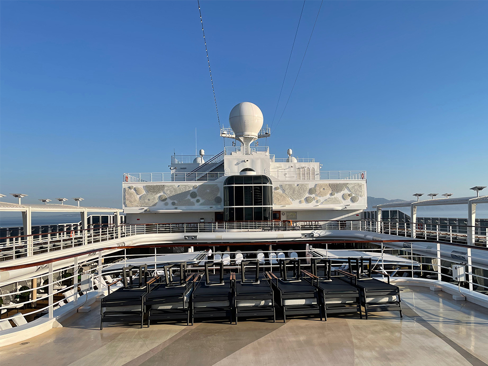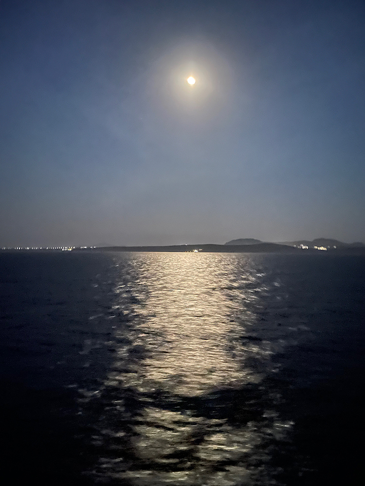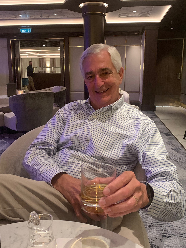 On return to the ship, Judy and I went to our final day of trivia games, collected a couple of items with our week’s winnings, then went to dinner at Chartreuse. Surprise. We shared a table with a couple from England who sat next to me at the tasting. The small world struck again! The dinner was excellent, and the conversation even better. After dinner it was grab a drink in the Meridian lounge, head up to Deck 8, and turn in for the night.