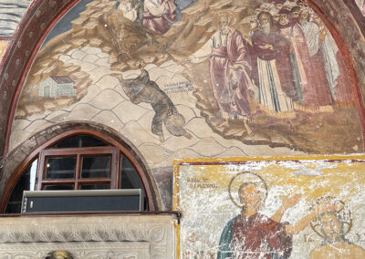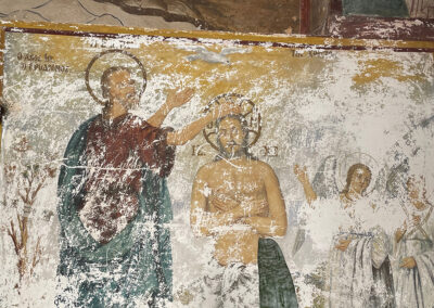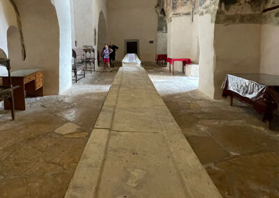 It was a bit of a hike, followed by a lot of steps, but we did make it to the Monastery of St. John, literally a mountaintop experience. This was another good visit. We gathered in a small courtyard for an introduction before we entered the really small chapel. The frescoes were really striking, even in their eroded condition. I kept thinking of the parallels to the manuscripts i worked with on my dissertation. Some of the same artistic considerations and approaches were apparent on every wall, since these dated not from antiquity but from the Middle Ages. To me just going this far was worth the climb to get here. The refectory was also a cool place to see, though it has been replaced with a newer dining room for the monks who live there now. There’s a marble table–not a marble-topped table, but a marble table–running the length of the room. Frescoes were scattered around the walls here as well, just not so many as in the chapel.