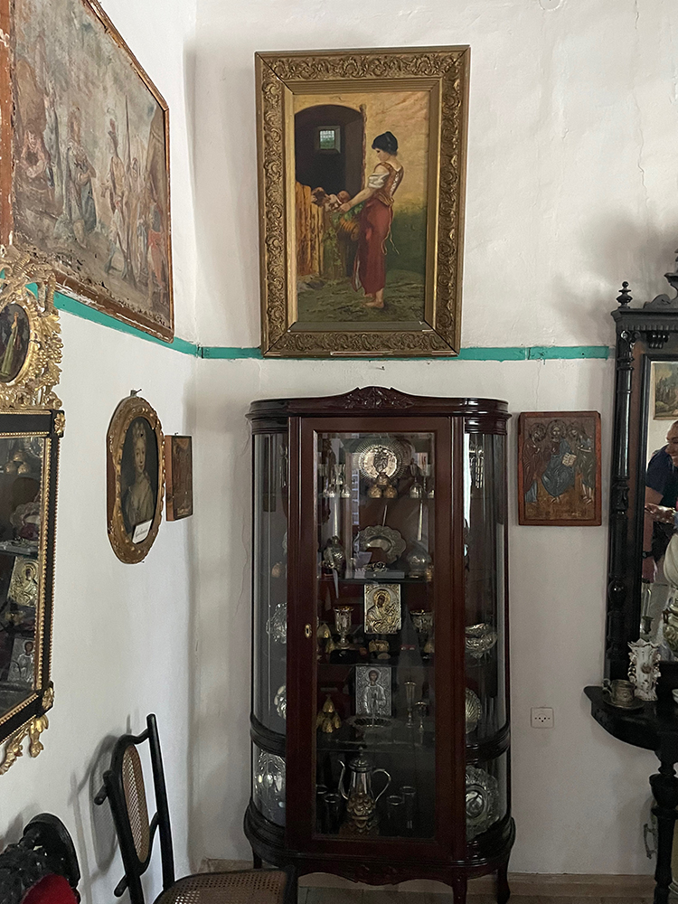 The first place we visited was the Mansion of Simantiris, a house built in 1625 that is still in the same family. Today it’s basically a house museum, with no one in residence. It’s filled with antique furniture, memorabilia, and many elements that reminded me of the nineteenth-century furniture and mementos we have at Cook Hill. I was really struck by that when in one room I saw a curved-front china cabinet with what was clearly a nineteenth-century genre painting above it. It might not have been The Roman Girl, but it could have easily been swapped with that one. We had run into that same situation, where elements from places half a world apart were almost identical, when we were in Croatia two years ago. It’s a small world after all, and in that respect we all live in the same place.