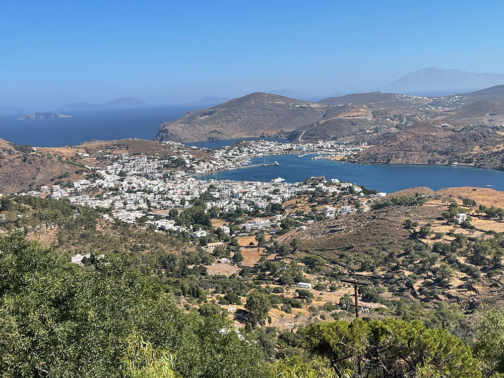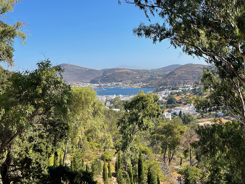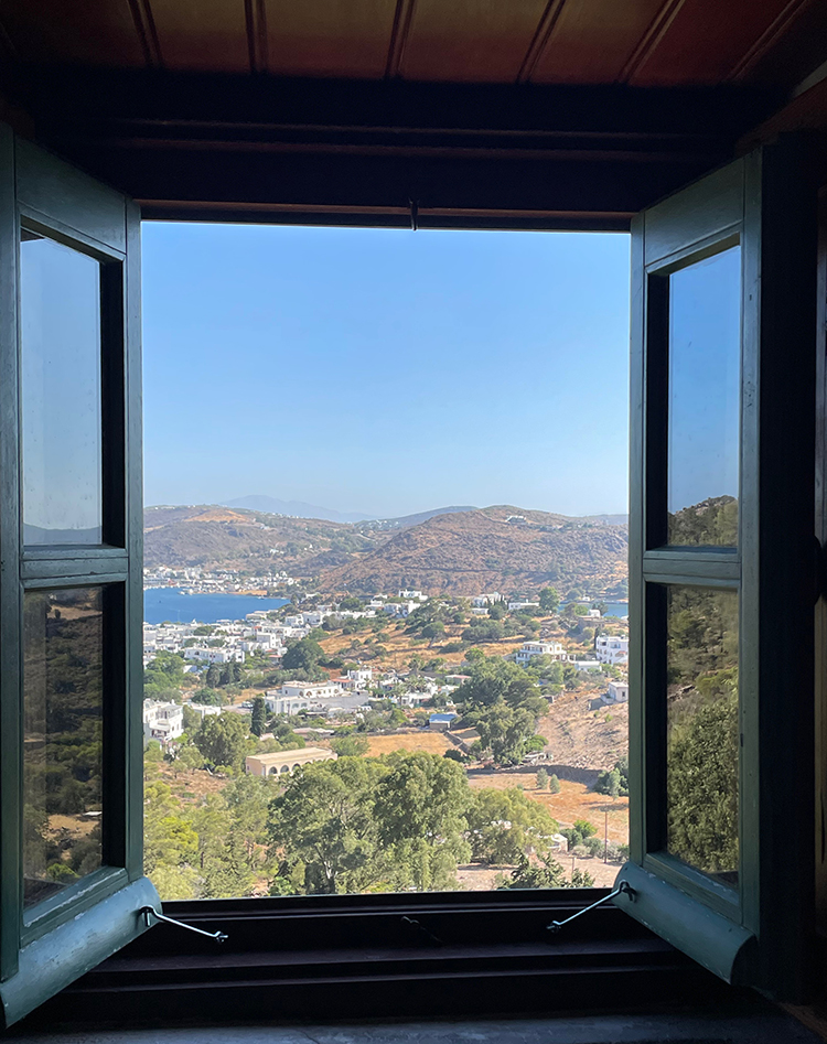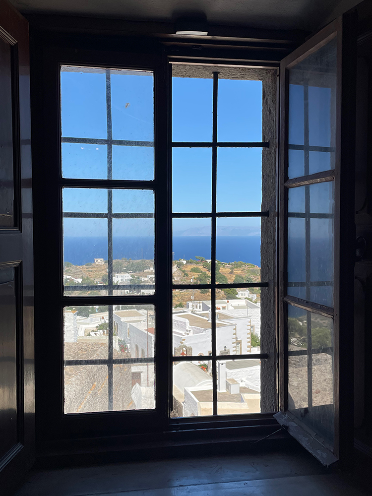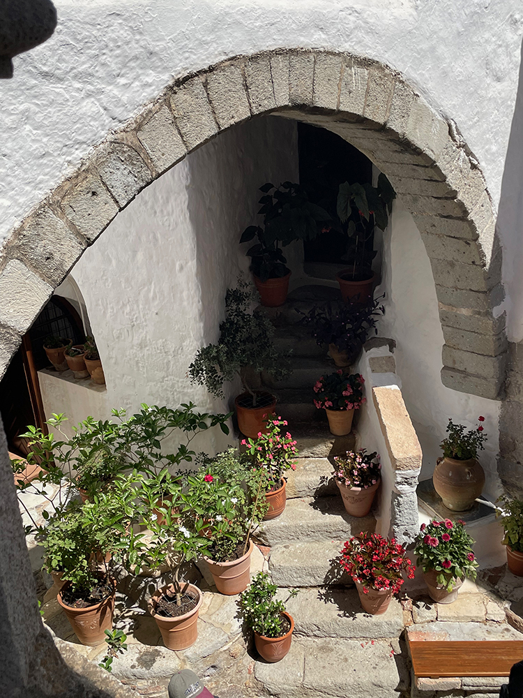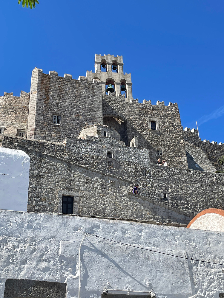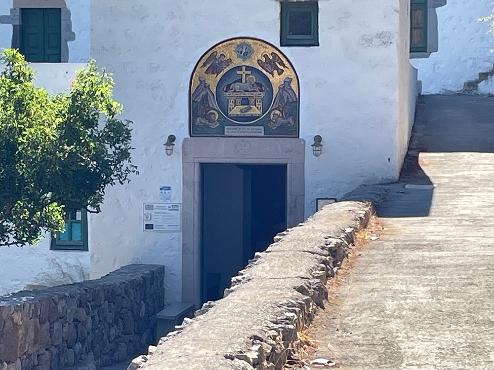 When we left this site we went to Hora, another of the three towns on this small island. Hora is at the top of the mountain and is the site of the St. John Monastery and Museum. The bus had a narrow road to follow with more than a few tight turns along the way. It couldn’t get through the narrow streets, and only a few places I saw in the town were on flat ground, so we got our exercise walking up and down hill a lot when we weren’t climbing steps.