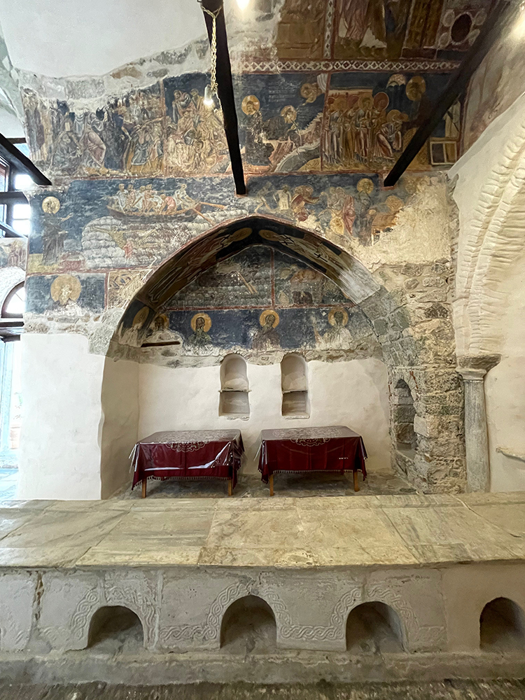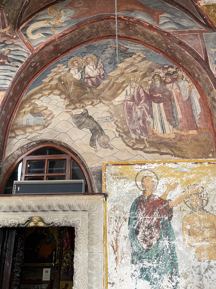 It was a bit of a hike, followed by a lot of steps, but we did make it to the Monastery of St. John, literally a mountaintop experience. This was another good visit. We gathered in a small courtyard for an introduction before we entered the really small chapel. The frescoes were really striking, even in their eroded condition. I kept thinking of the parallels to the manuscripts i worked with on my dissertation. Some of the same artistic considerations and approaches were apparent on every wall, since these dated not from antiquity but from the Middle Ages. To me just going this far was worth the climb to get here. The refectory was also a cool place to see, though it has been replaced with a newer dining room for the monks who live there now. There’s a marble table–not a marble-topped table, but a marble table–running the length of the room. Frescoes were scattered around the walls here as well, just not so many as in the chapel.