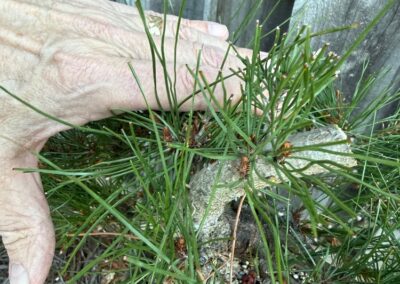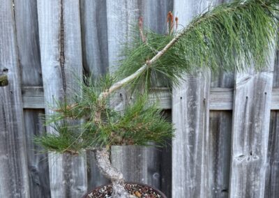 APRIL 3, 2025. I took this back to John, and he told me all I could do at this point was to shorten some candles. So that’s what I’ve done. The top is growing well, but I think I need to remove all but one of the candles on the top. APRIL 9 ADDENDUM. I’m a little regretful about shortening the candles, because some of them barely have any needles; the shaft is too long for that kind of treatment. It worked well on the black pines, but not so much on this one. There are a lot of adventitious buds popping u[p along the two-year-old extension of the trunk. A lot! As I look at the tree now, I think it will have to be a little taller than I had been thinking. I might have to do some more drawing so I can compare and study the overall shape of branches compared to the length of trunk below the first branch.