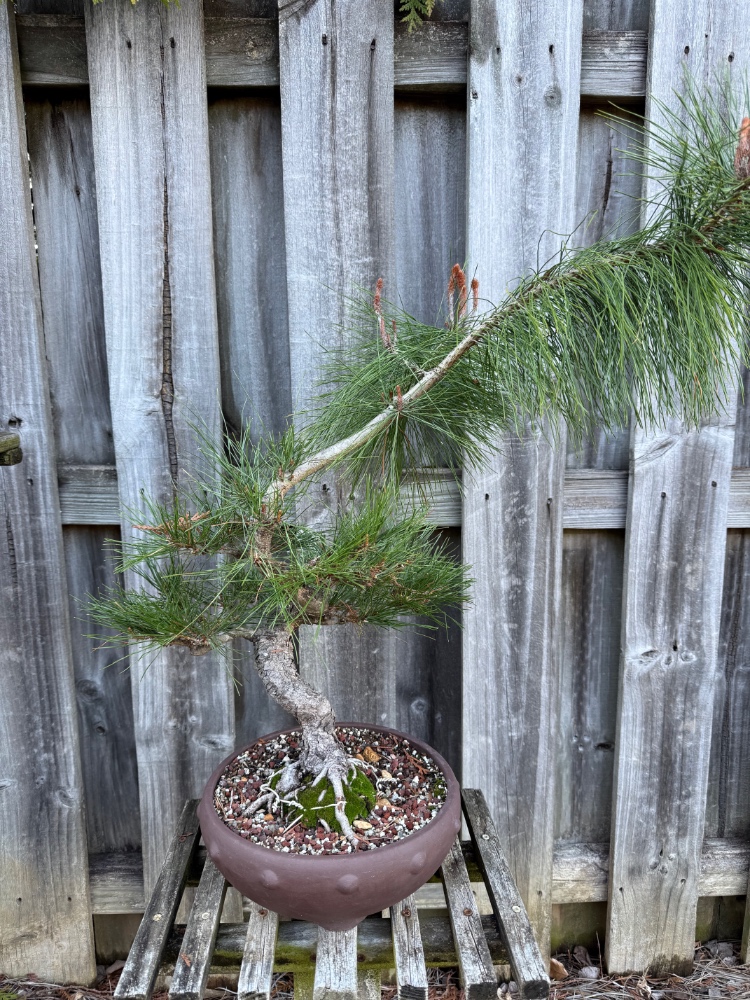 MARCH 3, 2023. I got this one repotted this week. It seems a little early, but the candles were already extending needles, so it was time! I was surprised to find it was planted in nothing but pumice; Trey might have told me that, but if he did, I didn’t remember. Now I’m a little worried that I might have used too soggy a soil mix. I’ll just have to watch how I water. Very closely. And upon reflection (love that phrase) I decided Jennifer was absolute right about the best front. The root alignment doesn’t look good from the other side, and I can live with the first bend going toward the viewer. Or I can monkey with the viewing angle a bit later on and keep the root spread visible. UPDATE MARCH 31. Two weeks after I repotted this tree we had a small freeze, and that’s the only thing I can think of that could have resulted in some crazy discoloration of the new foliage. Half of the new needles turned orange, and that has now faded a little. Still looks weird. See photo below.